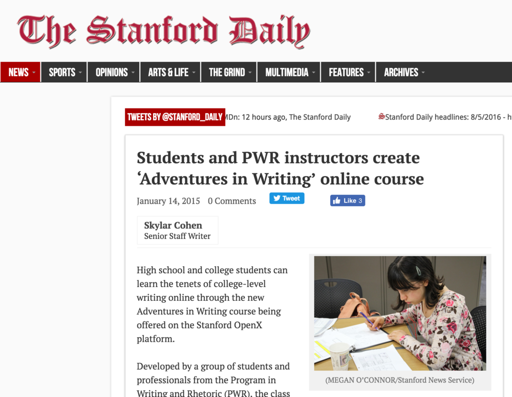 “Adventures in Writing” was an online course created for the Stanford Program in Writing and Rhetoric and Stanford Online.