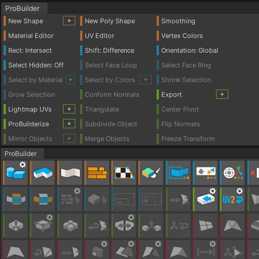 I had experience working with ProBuilder from creating the Real-time Animated Storytelling course. When I talked to users about the tool, some reported that they preferred the text menu while others said they preferred the icons menu. Many reported that they found ProBuilder to be confusing and difficult because of the number of options presented in a given menu.